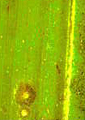 葉子的正面和背面均可被寄生。在綠葉上經常可以看到清晰的黃色光環圈,這表明昆蟲較大。